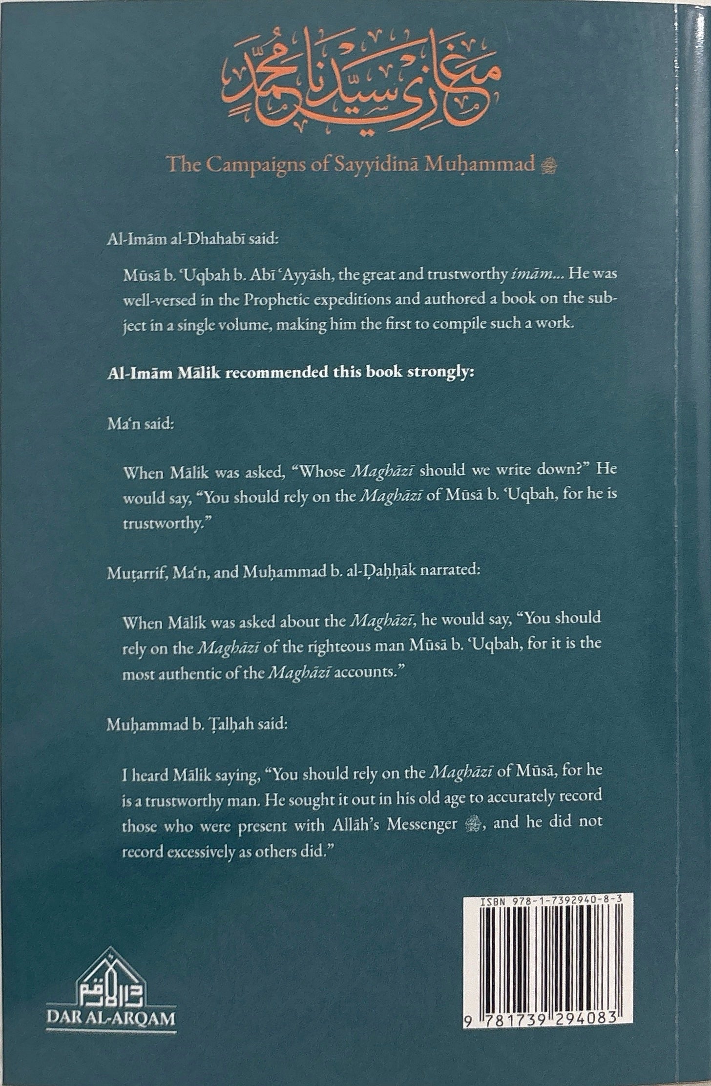 Al-Imam Malik recommended this book strongly: Ma’n said: When Malik was asked, “Whose Maghazi should we write down?” He would say, “You should rely on the Maghazi of Musa b. ‘Uqbah, for he is trustworthy.”